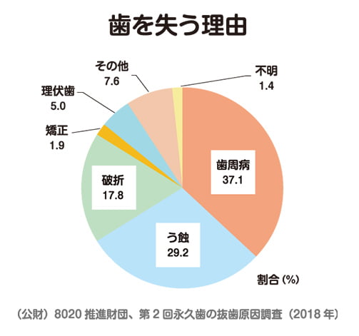 現在、日本人が歯を失う最大の原因は「歯周病」です。う蝕(むし歯)や歯の破折(歯が割れたり、折れたりすること)を抑え、原因の4割を占めています。