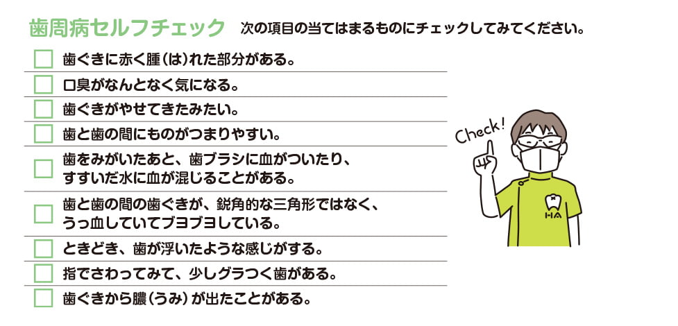 歯周病を初期のうちに見つけるためのセルフチェックです。1つでもチェックがあれば歯周病の可能性があります。かかりつけ歯科医で相談しましょう。