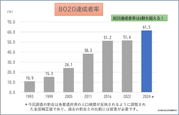 8020達成者率は61.5%(前回令和4年調査では51.6%)となり、6割を超えた。