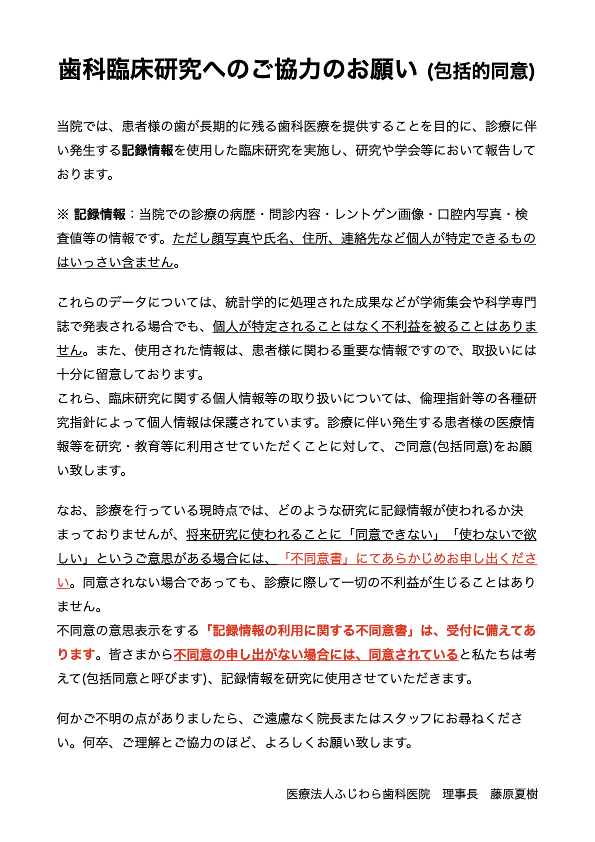 問診票、診療録、検査記録、エックス線写真、歯型、処方せん等の「個人情報」は、別掲の利用目的以外には使用しません。